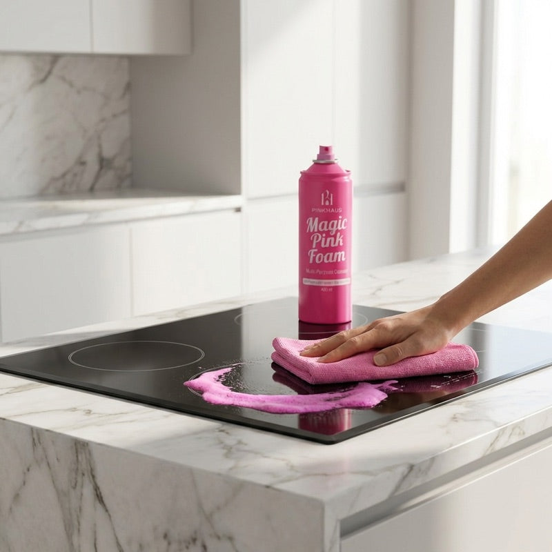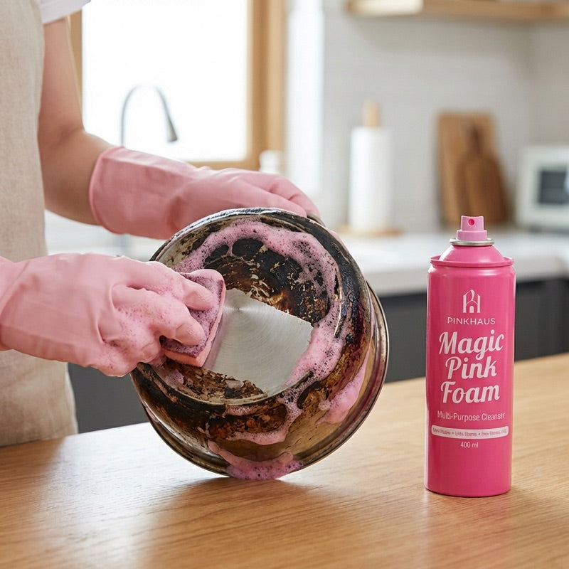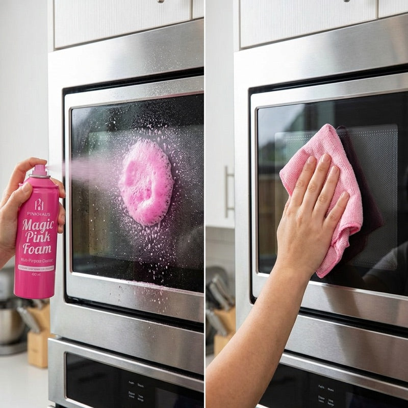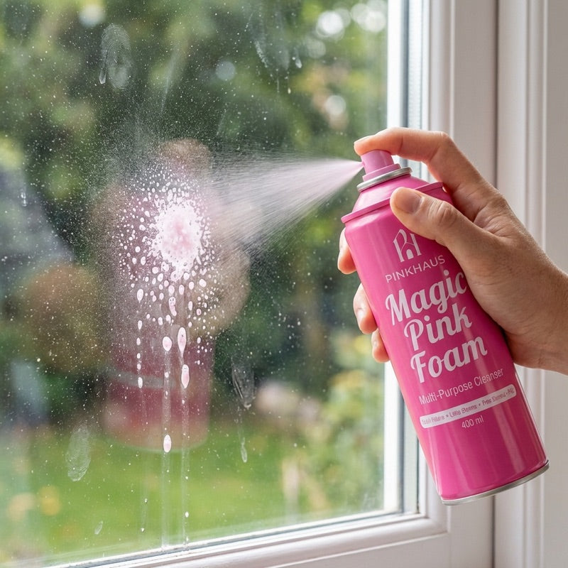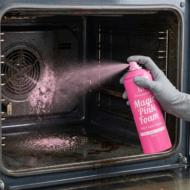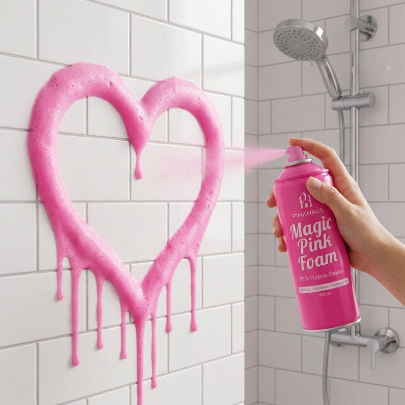 Köpük yüzeye temas ettiğinde pembeye döner — formül devreye girer, yağ ve kireç 30 saniyede çözülür. Antibakteriyel içerikli, 100'den fazla yüzeyde güvenle kullanılır. Tek marka, komple çözüm: Magic Pink Foam, Derz Temizleyici ve Cam Su İtici Sprey.